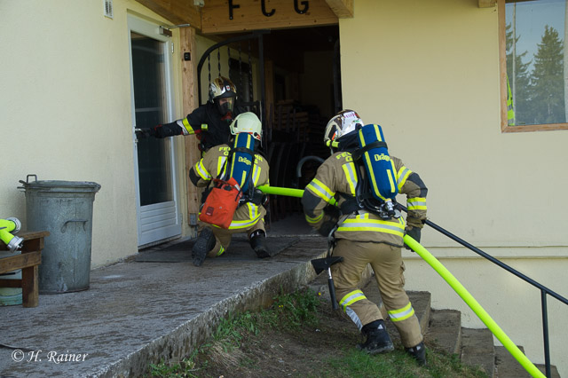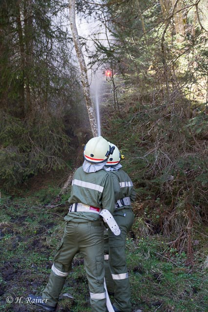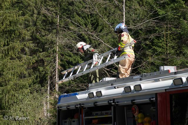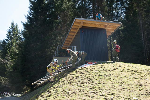 Bei Flämmarbeiten war ein Brand ausgebrochen, der sich auf den angrenzenden Wald ausgebreitet hatte. Beim fluchtartigen Verlassen des Daches war eine Person mit der Leiter umgestürzt und verletzt liegen geblieben, wodurch die zweite Person am Dach festsaß.