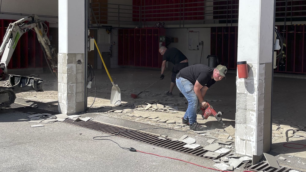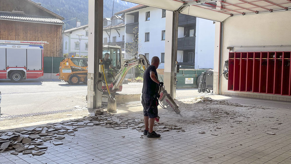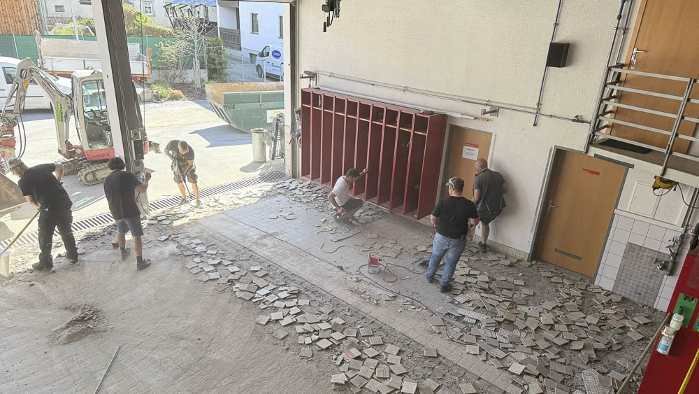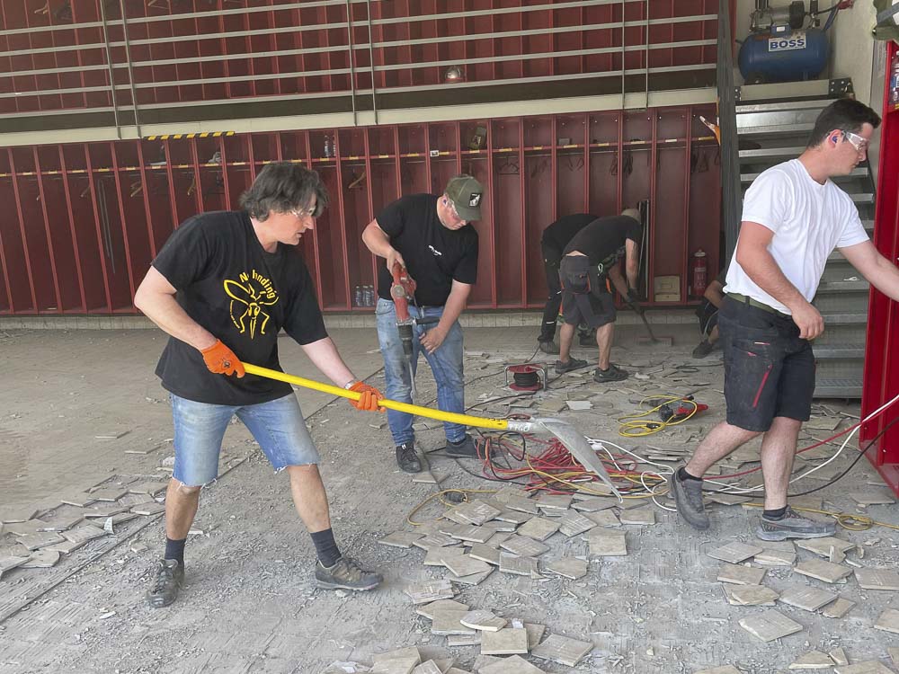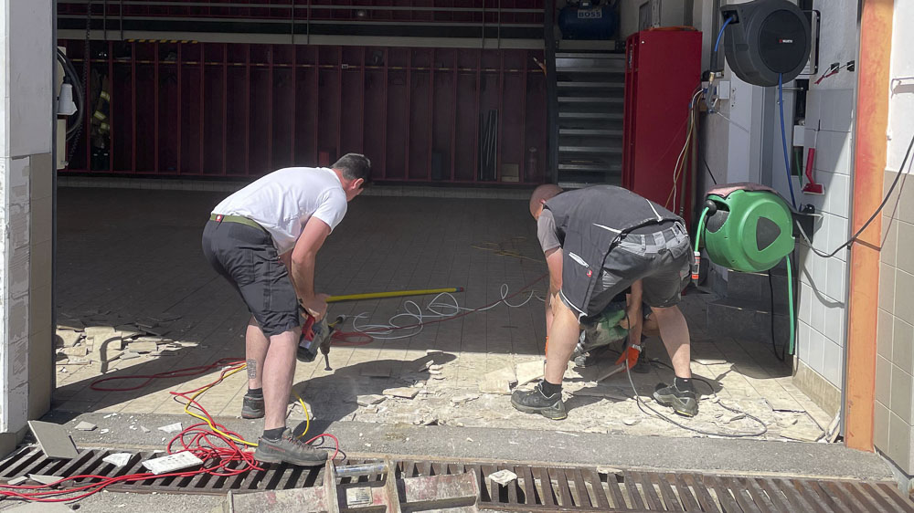 Der Hallenboden im Gerätehaus ist im Laufe der Jahre undicht geworden und im Aufenthaltsraum im Keller ist es bereits zu Nässeschäden gekommen. Um weiteren Gebäudeschäden vorzubeugen ist eine Sanierung des Bodenbelags unausweichlich.